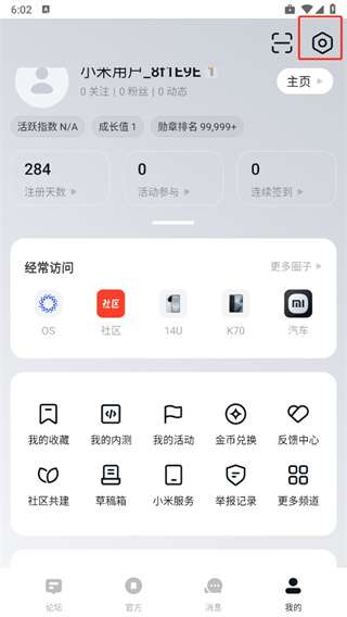 软件提交 专题合集 热门手游小米社区app怎么关闭广告,首先打开小米社区app软件,进入到首页中后可以切换到官方、消息、我的页面,我们点击右下角的【我的】,然后在我的页面中有很多的功能可以使用,在这点击右上角的【设置图标】。