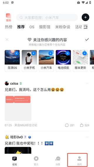 1、首先打开小米社区app软件,进入到首页中后可以切换到官方、消息、我的页面,我们点击右下角的【我的】;
