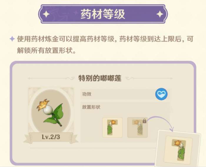 使用药材炼金可以提高药材等级,药材等级到达上限后,可解锁所有放置形状。