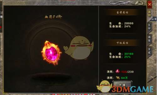 神炉可以升级血符,玄甲,魂珠,龙戒。血符玄甲满级为50阶,龙戒魂珠满级为30阶