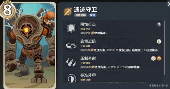 遗迹守卫:也是大家常说的“铁甲小宝”,它的元素战技是多段伤害,如果吃到了本关内的增幅buff,