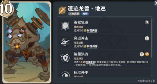遗迹龙兽.地巡:龙兽它强在,也是需要注意的是,附带元素汲取特性,敌方第一次被挂元素后,会拥有对应元素的减伤,