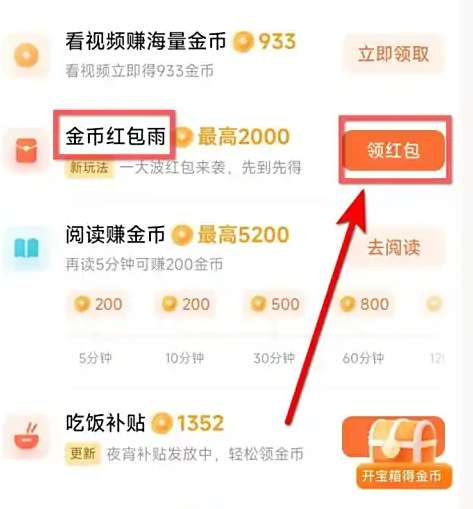 进入福利页面,找到金币红包雨,点击右侧的领红包