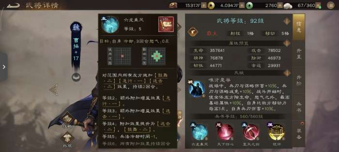 核心增益:叠加天赋与“六龙乘风”,可提供25%最高属性、1点移动力、20%连击率,辅助能力顶尖。