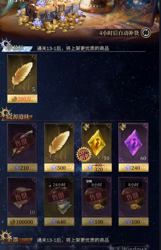 资源道具:这里可购买打折的羽毛和神明升级的金币,经验,突破道具,资源充足的话建议都买,不管买多少,中期都不够用。
