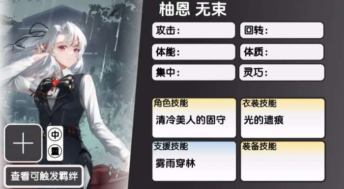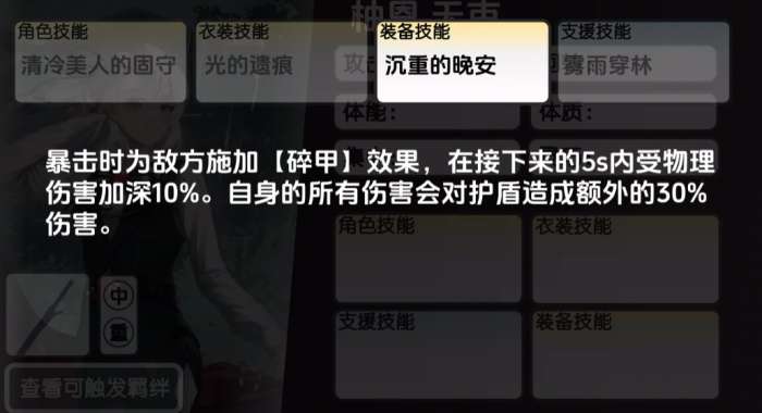 装备技能大家可以选用沉重的晚安,有了这个技能效果柚恩就可以在暴击时为敌方施加【碎甲】效果,在接下来的5秒内受物理伤害加深10%,且她自身的所有伤害会对护盾造成额外的30%伤害。柚恩最后的支援技能叫做雾雨穿林,这个支援的效果是当己方有角色护盾被击破时就可以触发技能的能力,此时柚恩会发动一次特殊攻击【破雾】带来输出,但是这个支援技能的效果是每8秒只能触发一次的,所以大家要计算好使用间隙。