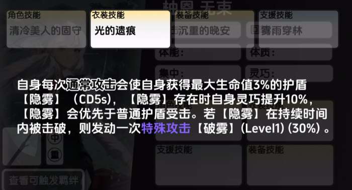 衣装技能叫做光的遗痕,只要是柚恩使用这个技能,那么每一次使用通常攻击的时候,都会使她自身获得最大生命值3%的护盾【隐雾】,这个护盾的持续时间是达到了5s的,而【隐雾】属于她的一个专属状态,生效的时候只要存在场上,那么柚恩自身的灵巧会提升10%,然后【隐雾】会优先于普通护盾受击,如果【隐雾】在持续时间内被击破,则发动一次特殊攻击叫做【破雾】,输出也有30%左右的提升效果。