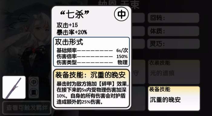 柚恩的技能其实非常适配蛞蝓,但是装备栏限制了只能携带中型和重型装备,如果有队友的情况下其实也可以选别的,所以这里大家可以尝试选择七杀重剑追输出,她搭配了七杀之后攻击上面有+15的数值提升,然后在暴击率上面也有20%的加成,这样再基础的频率上面就可以达到6s/次的输出,然后伤害倍率也可以达到150%的数值,同时伤害类型就是基础的物理伤害。