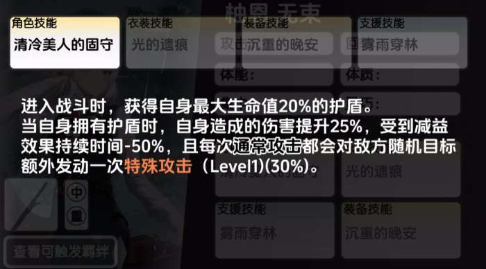 柚恩角色技能上面可用的是清冷美人的固守这个技能,效果是一到进入战斗时,柚恩就可以获得自身最大生命值20%的护盾,当她自身拥有护盾时,可以造成的伤害就会提升25%,切受到减益效果持续时间-50%,这里只要是技能生效那么每一次通常攻击都会对敌方随机目标额外发动一次特殊攻击,所以算是一个通常攻击的强化效果。