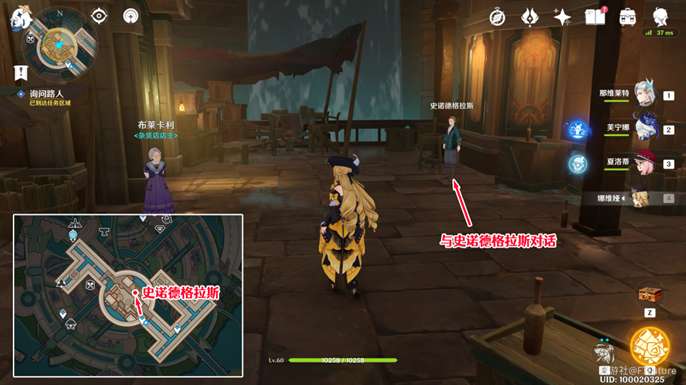 调查结束后,我们传送到枫丹廷地下的灰河,到图示位置与史诺德格拉斯对话,询问有关勒鲁瓦的信息(这里其实省略了一步,感兴趣的旅行者也可以先和杂货店店主布莱卡利对话,因为我们在屋后找到的是这里的收据)