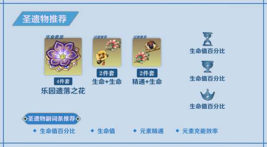 如果你非常喜欢这个角色,并想要在毕业时达到最高境界,可以考虑使用花神四件装备(乐园遗落之花),并在副属性上追求大量的小生命属性,以确保在配队中吃到双水时生命值尽可能靠近74444,这样可获得最高的天赋收益。