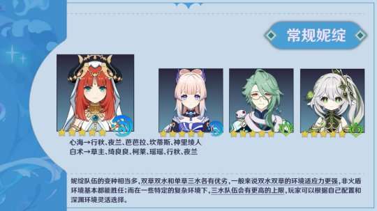 1、在三水队伍中经常需求草神站场来保持草底,而身板较脆的草神作为妮绽放队的前台会有较大的生存压力。