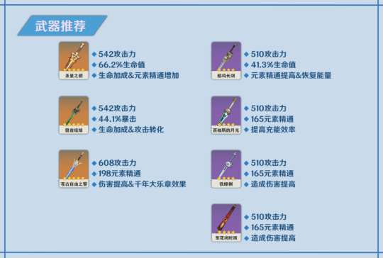 在五星武器方面,专武圣显之钥是绝对最佳的选择,因为它可以让你获得高额的生命值加成和全队精通加成,从而最大化草种子的伤害。与此同时,其他的五星武器适配度相对较低,因此我们不推荐使用它们。