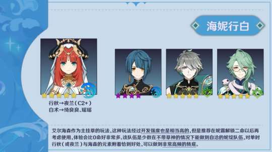 这种玩法开发难度相当高,建议在妮露解锁二命之后再考虑使用,这样体验会好得多。该队伍是其中一支可以在没有草神的情况下做到自洽的妮绽队伍,对于单人作战时的行秋(或夜兰)和海森的元素附着能恰到好处,可以实现高频率的转底。