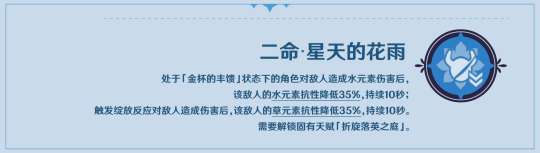 第二个草系角色有能力将怪物身上的水附着转化成草附着,从而提供第二个水底转草底的方法,使得排轴更加灵活。