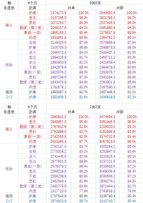 可以看出,魈的圣遗物中猎人是最优的,其次是辰砂,而楼阁因为重击的原因影响输出,和2+2表现差不多,都不推荐。虽然猎人比辰砂更好,但是在0闲0芙且魈使用暴伤武器时,猎人的提升幅度仅有2%~3%,如果魈使用攻击类武器,则提升幅度可以达到7%~10%。而如果对比0闲0芙下的辰砂鸟枪,最好的猎人护摩也只提升了3%不到,所以如果你的魈队金数不高但是已经精细养成过了,依然可以放心使用以前的辰砂套。而对于2闲2芙的高金配置来说,就算魈用暴伤武器,猎人的提升也可以达到7%——高金时只推荐魈使用猎人套。