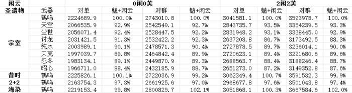 ▮闲云:下面给出闲云不同武器和圣遗物情况下魈+闲云的对单/对群输出情况对比: