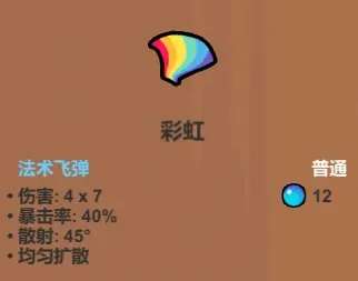 跟蝴蝶类似,但实际伤害比蝴蝶高很多,因为它自带高暴击,且自带贯穿,是可以在暴击流使用的。虽然它的散射不易命中,但可以用寻踪让它变成集束伤害,寻踪也可以打出二段伤害(贯通伤害+顶端星芒伤害)。本身射击距离较短,搭配引线可以解决这个问题(搭引线也能触发二段伤害)。它也是非常适合闪电链,闪电链对它的增益很高。但即使有这么多buff叠加在一起,它的伤害及伤害范围也称不上很优秀,只能说能用,不差。升级后也没有新词条。