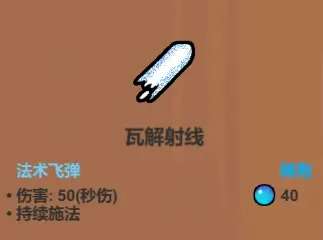 滋水枪,本身很不好用,也是持续时间内不能干别的,而且命中不易,搭毒还能给你整一地毒液。但它跟瓦解射线差不多,搭配引线就能变成一个还算不错的法术。它不像瓦解射线那样具有贯通效果,但由于耗蓝更低伤害更高,对单体反而比瓦解射线要高。升级后也没有新词条。
