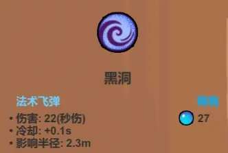 黑洞是最全面的纯输出法术之一,主要是因为黑洞不受任何障碍物限制,自带一定的对怪牵引效果,而且适合搭配的法术非常多,只是它也有一定的后坐力。没寻踪前其实不好用,但搭配寻踪就非常强了。升级后增加击杀提高半径的效果,但实际上这个词条作用不大。