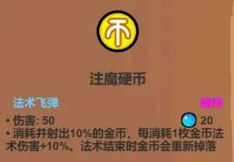 注魔硬币可以说是最强的单体输出法术了,身上钱越多伤害越高,尤其适合金币流打法,拿到这个法术你就可以考虑走金币流。唯一的问题是你打完还要去捡钱,不然影响后续伤害。搭配雷霆核心穿透等也能让单体法术变成群伤。然后就是,有时打完一轮后你会发现掉落的金币会稍微增加一点点,我也不知道是怎么一回事。最后,独特法术和史诗一样不能升级,它还不能加工房洗。