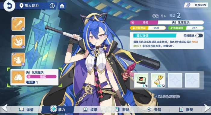援助技是密涅瓦的核心,密涅瓦在释放它时能对敌人直接造成伤害,还可对敌人施加星芒效果,每三秒就会有一层星芒爆掉,触发时不光能再次对敌人造成伤害,敌人也会因星芒爆开的关系而被施加上光系印记,令主控角色能更频繁地通过打爆印记来打出额外的伤害。其绝招则是能持续性地造成范围光系伤害,每次攻击间隔为0.3秒,共持续5秒,总伤害量特别的高,在敌人较多的场合中能有效地通过绝招来实现快速清屏,而在单体敌人的作战环境下,绝招的伤害也能为队伍补足不少的输出。