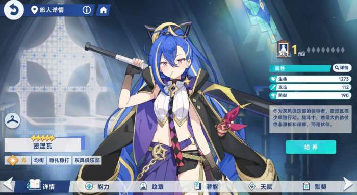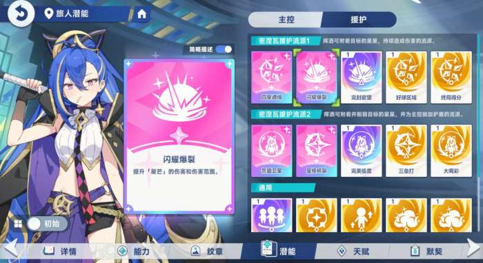 而在潜能的选择上,密涅瓦可走更注重伤害的星芒流,也能走更偏向保护主控生存的护盾流。为密涅瓦选择星芒流时,可通过挑选四星通缉、闪耀爆裂和完封欲望,来强化星芒爆开的伤害和密涅瓦持续对目标造成光属性伤害的能力。当整个队伍的练度和伤害足够时,此流派会令玩家获得很出的割草体验,也能极为迅速地完成关卡挑战。走护盾流则更偏向让密涅瓦来为主控角色提供生存能力,可让她在释放技能时,为主控生成额外的护盾,潜能选誓萌卫星、星核碎裂与完美弧度。