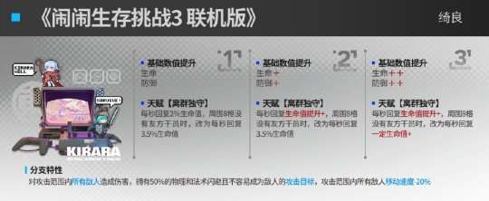 当干员周围8格没有其他友方干员时,每秒回复2%生命值的效果将改为每秒回复3.5%生命值。