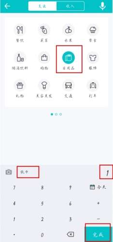 3、下面就以【支出】作为例子,选中【日用品】,再写上“纸巾”“1元”,最后点击完成就可以啦;