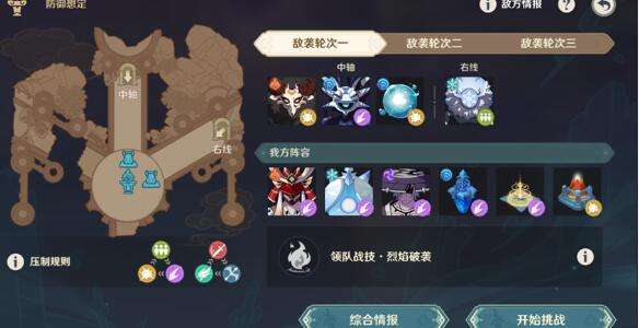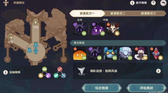 敌袭特点:左右两线敌人分布均匀,且每个轮次敌人的元素属性变化较大。