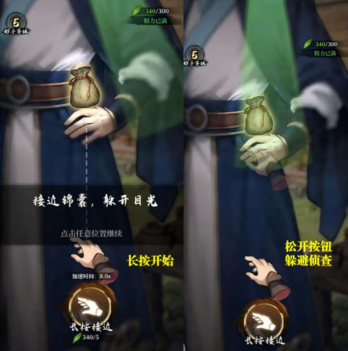 长按屏幕控制手的移动,使其逐渐接近锦囊;