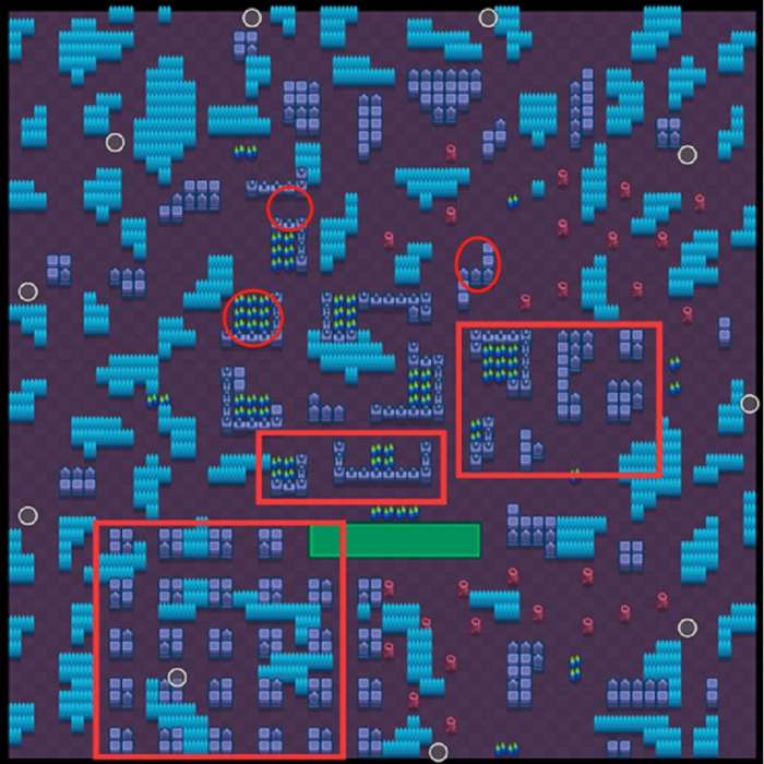图中红框的位置都是障碍物较多,且周围都可以很直观的看到是否有敌人,一旦发现了敌人就尽量将位置保持在敌方位置的对立面并且稍稍微拉远。