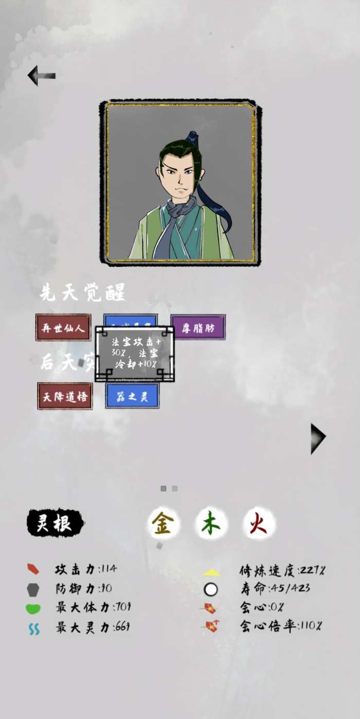 开局必须金木火属性,木头人,丹体,丹炉作为主要属性都可以,我刚好刷了仙人属性,解锁3个装备格,可以防止前期装备被偷。