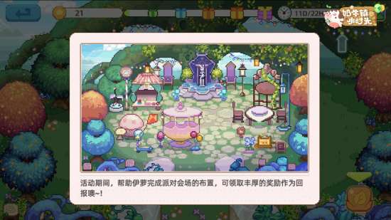 在获得伊萝的家具后,需要在规定的时间内,按照伊萝给你的照片,完成派对会场的布置。在帮助伊萝将派对布置成她要求的样子后,伊萝会奖励你一株“晶石香雪兰”,你可以用它穿梭时空,进入一个名为“灵翼森林”的新区域,在那里,你可以耕种或者摆设建筑,提升庄园的繁荣度。