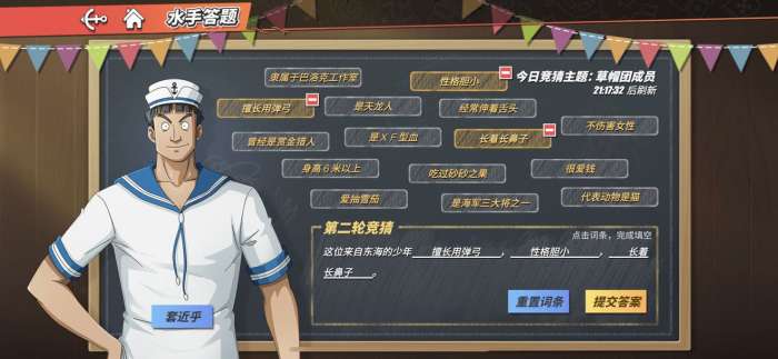 猜出水手心中想的海上伙伴!每日3个竞猜轮次,猜中即可开启神秘宝箱!神秘宝箱内含黄金之果、S级伙伴随机碎片等稀有道具。