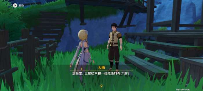 到达轻策庄找到「路爷」后与其对话,过剧情,剧情过后「大雨」让寻找三根松木和一份红颜料并交给他。