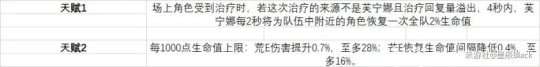 芙宁娜的核心天赋是天赋1。如果芙宁娜的队伍中有其它治疗来源并且前排角色已经被治疗满了,那么芙宁娜会进行两次全队治疗来协助。这样可以更快地叠加Q技能。但是,如果六命芙宁娜是队伍中唯一的治疗,天赋1将不会生效。