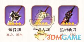 1、螭骨剑:这是一把副属性为暴击率的双手剑,精五后的50%增伤让它和五星双手剑比都不占下风。适用于所有输出向的双手剑角色,但需要注意如果不是对自己的走位有绝对自信,最好搭配盾辅使用。