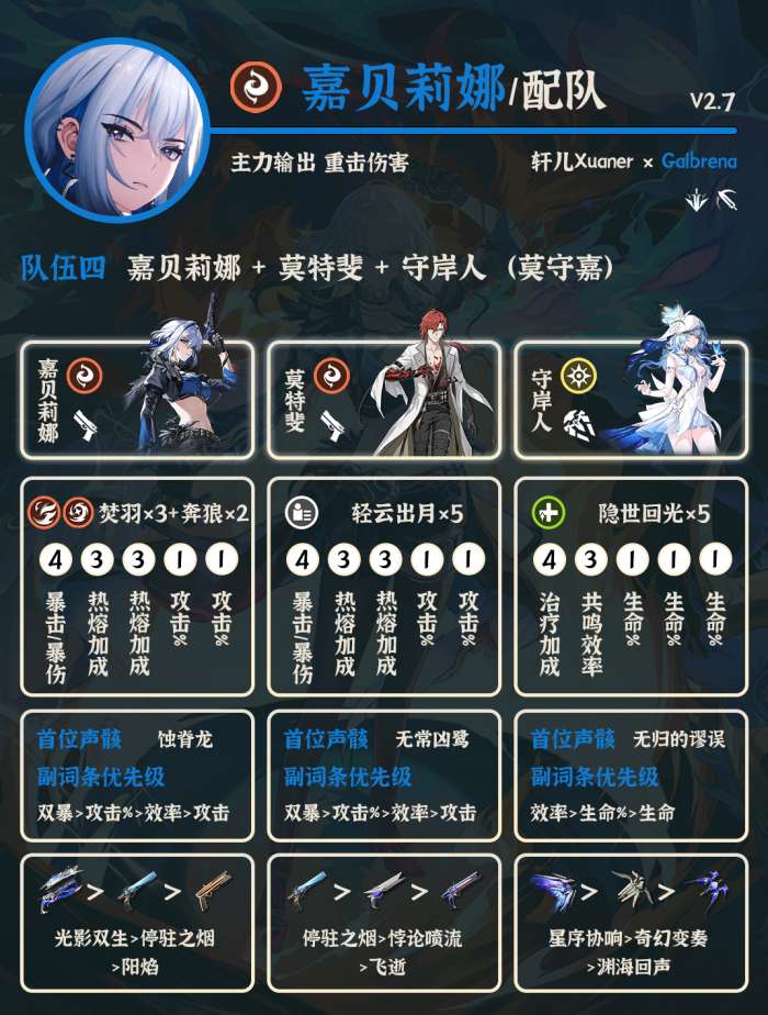 这套主要打声骸双C,没有其它可代替角色。嘉贝莉娜吃弗洛洛重击加成。