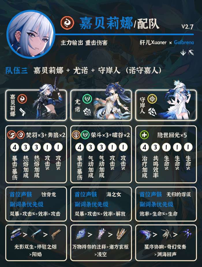 这套主要吃尤诺的重击加成,但因为嘉贝莉娜声骸伤害占比要比重击伤害占比高,所以不如仇远。
