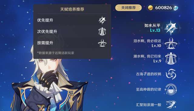 最后就是主C的天赋,一般来说,我们只用优先升级主要站场输出手段即可。比如龙王的普攻,仆人的普攻。如果实在搞不懂,直接点右上角的天赋升级推荐即可,升级最主要的就行,后续资源充足时,再补充第二个。最后一个推荐,一般来说,都是可升可不升的。