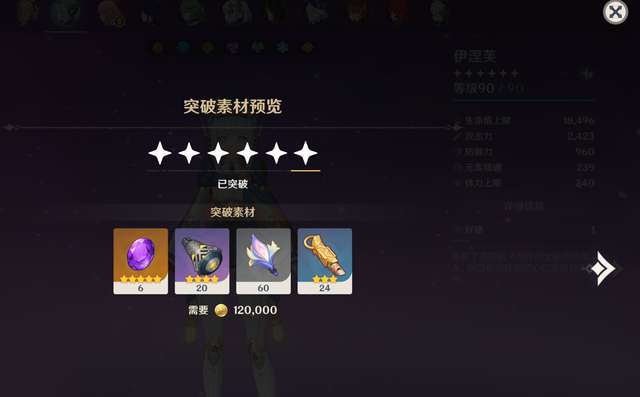 养一个角色究竟要用多少资源呢?咱们就以从1-90级,养一个伊涅芙为例,从1级到90级,需要419本紫色经验书,一共需要摩拉209万,此消耗不包含天赋材料、武器升级所需的摩拉。