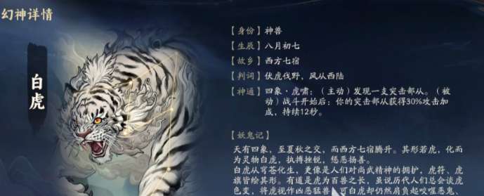 游戏里的幻神角色有很多,白虎是一个相对来说比较灵活的,在挑战的过程中,白虎可以主动发现突击部队,这样在了解对方的情况之后,大家也能更加快速的组建属于自己的突击部队,对战的时候,这支部队还能获得额外30%的攻击力,非常适合在前期对战的时候,快速提升自己的能力,但这个幻神只适合在游戏里想要快速上分的玩家,假如喜欢的是相对比较长久的对抗,那就可以考虑选择其他的幻神角色。