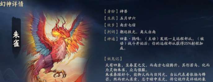 除了白虎之外,游戏里还会有很多幻神,每一个的能力也会各有区别,朱雀是非常适合远程对抗的,很多新手玩家初期能力不足,这个时候不想和对方保持太近的距离,可以选择利用朱雀在游戏里开启远程对抗,另外就是一旦这个幻神加入到阵营,那整个场上的远程角色射程都能提升25%,在这种设定下,角色可能都没有靠近玩家,就会直接遭到迎头痛击,和白虎一样,都是非常适合新手去选择的幻神,如果感觉自己战斗能力不足的话,那就可以尝试使用朱雀。