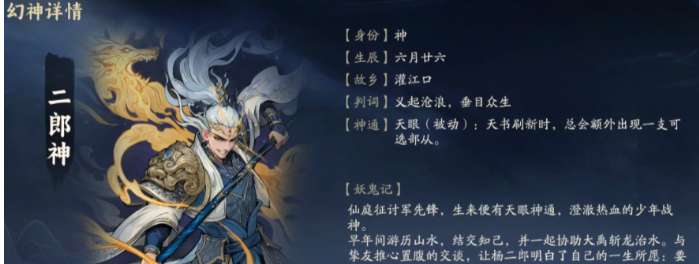 除了这几个神兽幻神之外,还有其他的神话角色幻神,很多玩家也会优先选择在游戏里使用二郎神,这个角色的设定比较独特,本身对于战斗能力是没有加成作用的,可以让玩家在挑战的过程中,能有比较高的概率从天书里获取自己想要的阵容,现有快速完成整体阵容的搭配,那就可以优先选择二郎神,同时这也是非常适合新手玩家的,很多人在游戏前期没有思路,就可以选择用这个阵容来实现整体的碾压。