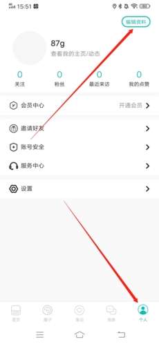 1、进入APP后,首先点击右下角“个人”,再点击右上侧的“编辑资料”;