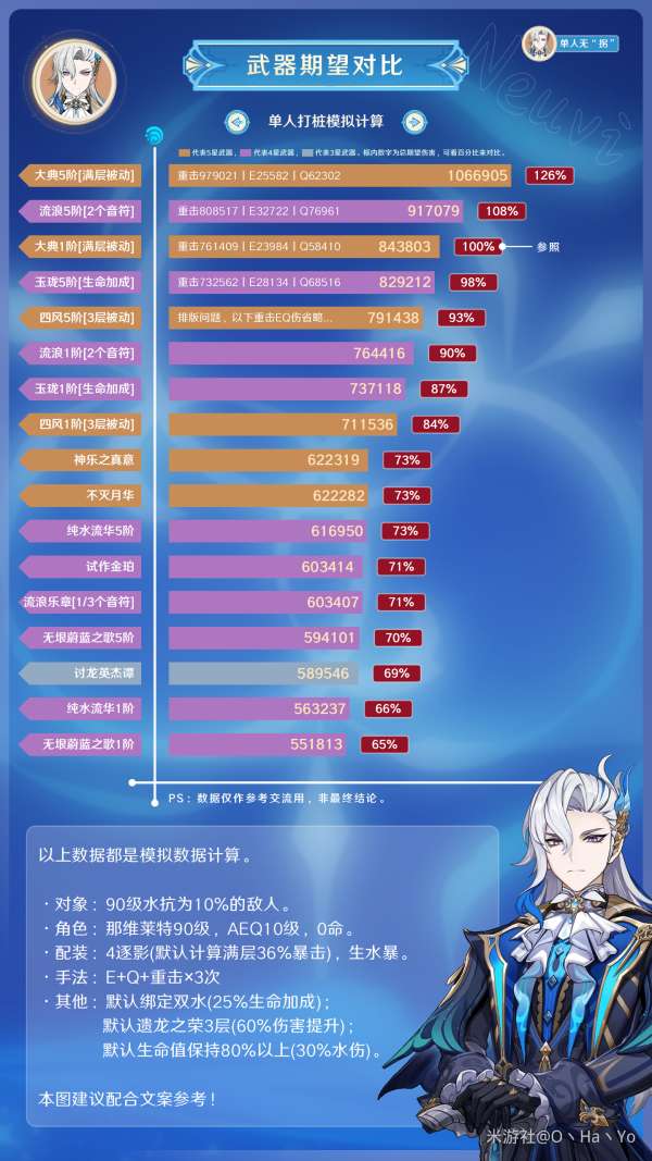 4星武器中表现出色的是遗祀玉珑,因为它的暴击率和生命值非常适合。其次,如果试作金珀的锻造原料很少,就不需要专门为那维莱特锻造纯水流华。5阶的纯水流华和1阶的试作金珀之间的差距只有2%,而纯水流华只能为伤害加成提供攻击,这可能是唯一的受益者。此外,试作金珀可以缓解那维莱特的能量回复瓶颈,因此非常适合。在4.1版本的活动中,可以免费获取无垠蔚蓝之歌,可以提供充能和重击伤害加成,也非常适用。