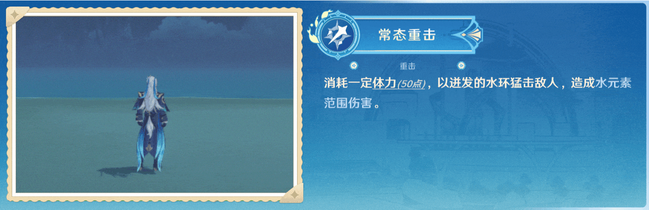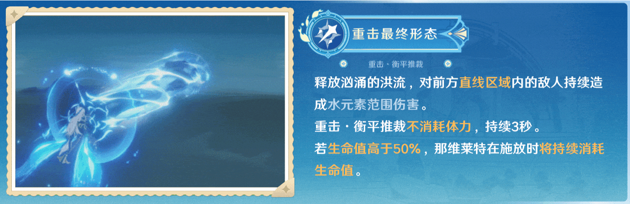 最终形态的重击不需要消耗体力,只需要保持此形态3秒即可,无需长时间按住A键。同时,该形态没有“锁面板”的机制,可以随时查看角色属性面板。该重击可以对敌人造成8次水元素伤害,附着能力会受到附着次数和大约3秒的冷却时间的影响。每次附着都会给敌人施加弱水附着效果。