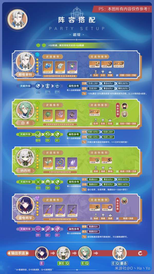 没有必要再次介绍角色,因为只要在现场有那维莱特,就会获得1层固有的遗龙之荣效果,这相当于常驻的1层效果。在阵容搭配方面,只需要搭配2个与水元素相关反应的不同角色,即可获得60%的伤害提升。最后一个角色可以选择水元素角色,这样就能解决能量球产生的问题,回能且提供双重水属性,从而满足那维莱特的需求。总的来说,这种组合非常完美。