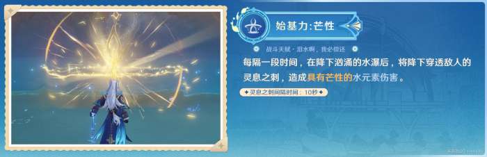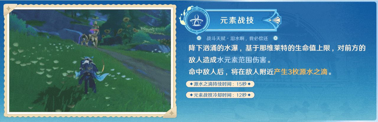 只要队伍中的任何角色使用水相关的技能对敌人造成反应,就会提供增加伤害的效果。这些反应每种都会单独计时,持续时间为30秒,在整个队伍循环中能够持续生效。